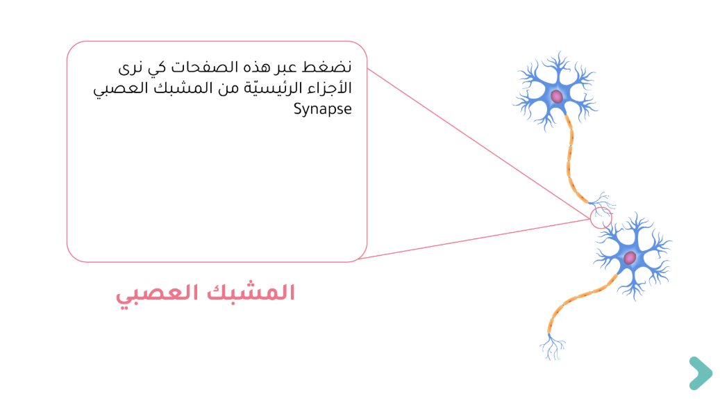 • إلا أنّ هذا الاتّصال ليس اتصالاً مباشراً لأنّ هناك فجوة صغيرة جداً بين العصبونين تُدعى المشبك. والإشارة الكهربائية الواصلة إلى محور العصبون المرسل تتسبّب في إطلاق مادة كيميائية تدعى "الناقل العصبي"، وهي التي تحمل "الرسالة" عبر المشبك إلى أجهزة الاستقبال في تغصنّات العصبون التالي. ويحدث هذا ملايين المرّات وبسرعة فائقة في خلال ساعات نومنا أو صحونا على حدّ سواء. كلّ ما يحدث في عقلنا وجسدنا يحدث بهذه الطريقة وذلك من خلال دماغنا.