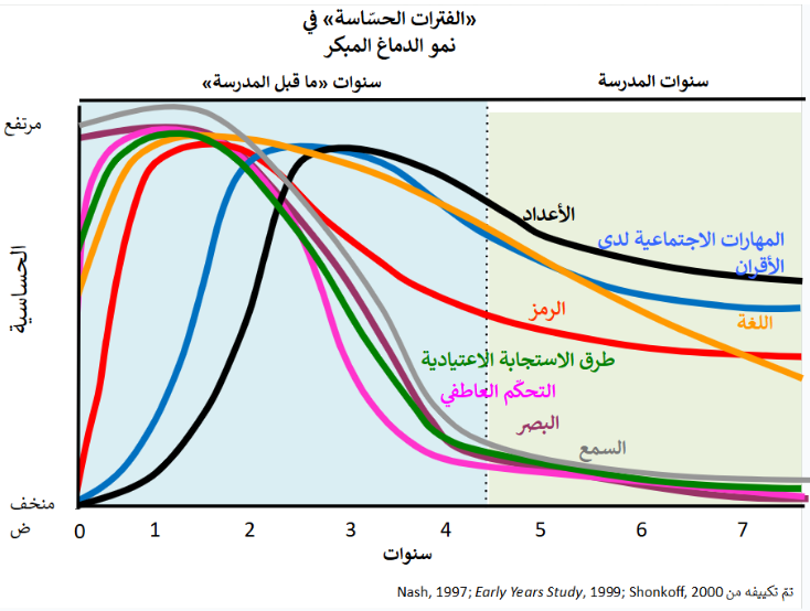 من المهم فهم طبيعة الفترات الحساسة، ولاسيما عند التفكير في كيفية دعم النمو الأمثل. الفترة الحساسة هي فترة زمنية ضمن تطور الدائرة العصبية تؤثر فيها التجربة بشدة على كيفية بناء الدائرة. وكما يقول بُويْس أعلاه، فإن هذه الفترات تشبه النوافذ المفتوحة عندما تكون العقول عرضة بشدّة لتأثيرات التجربة. توضح هذه الشريحة هذا المفهوم من خلال إظهار كيفية حصول تشكُّل نقاط الاشتباك العصبي للمسارات العصبية المختلفة في أوقات مختلفة. على سبيل المثال، تحدث الفترة الحساسة لتطور الرؤية (وعندما نرى أكبر قدر من تكوين المشبك) قبل الفترة الحساسة لنمو المهارات الاجتماعية للأقران